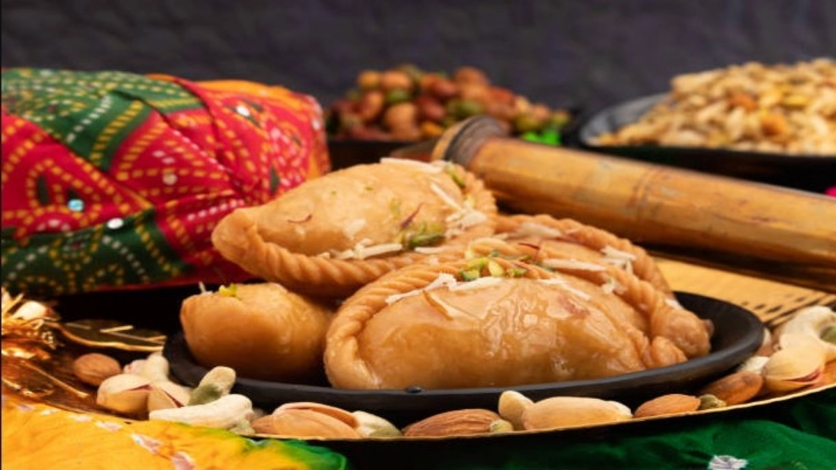 Karanji, also known as gujiya, is a crispy pastry stuffed with a sweet filling of coconut, jaggery, and dry fruits. The outer shell is delicately fried to a golden brown, creating a satisfying crunch that complements the rich, flavorful filling inside.