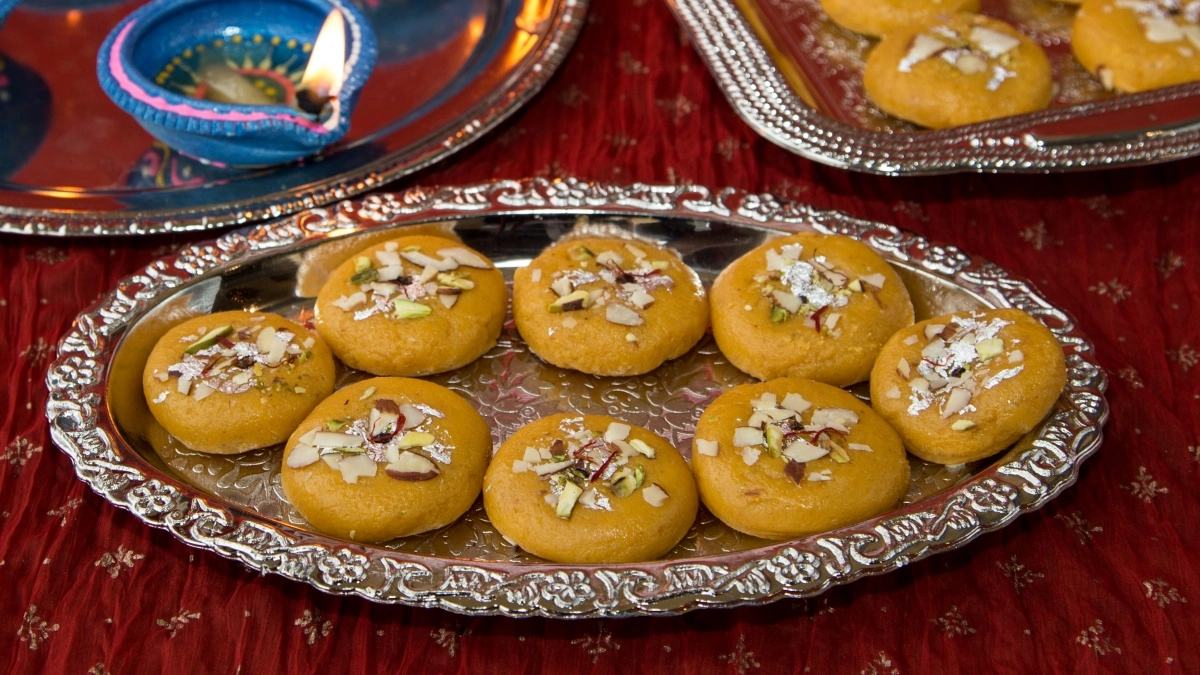 Pedha is a rich, creamy sweet made from condensed milk or milk solids (khoya), flavoured with cardamom, and often garnished with nuts like almonds or pistachios. Its smooth texture and sweet, aromatic flavour make it a popular choice for festive occasions, including Ganesh Chaturthi.