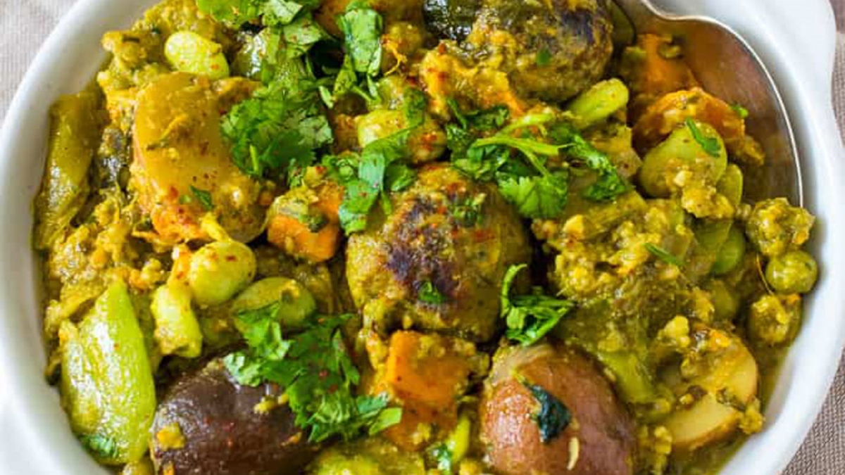 A rich and aromatic mixed vegetable dish, Undhiyu is a festive speciality in Gujarat. It's made with a variety of winter vegetables such as surti papdi (broad beans), brinjal (eggplant), sweet potatoes, and green peas, cooked with spices and fresh fenugreek leaves (methi). It's traditionally slow-cooked in an earthen pot, resulting in a deliciously flavourful medley of vegetables.