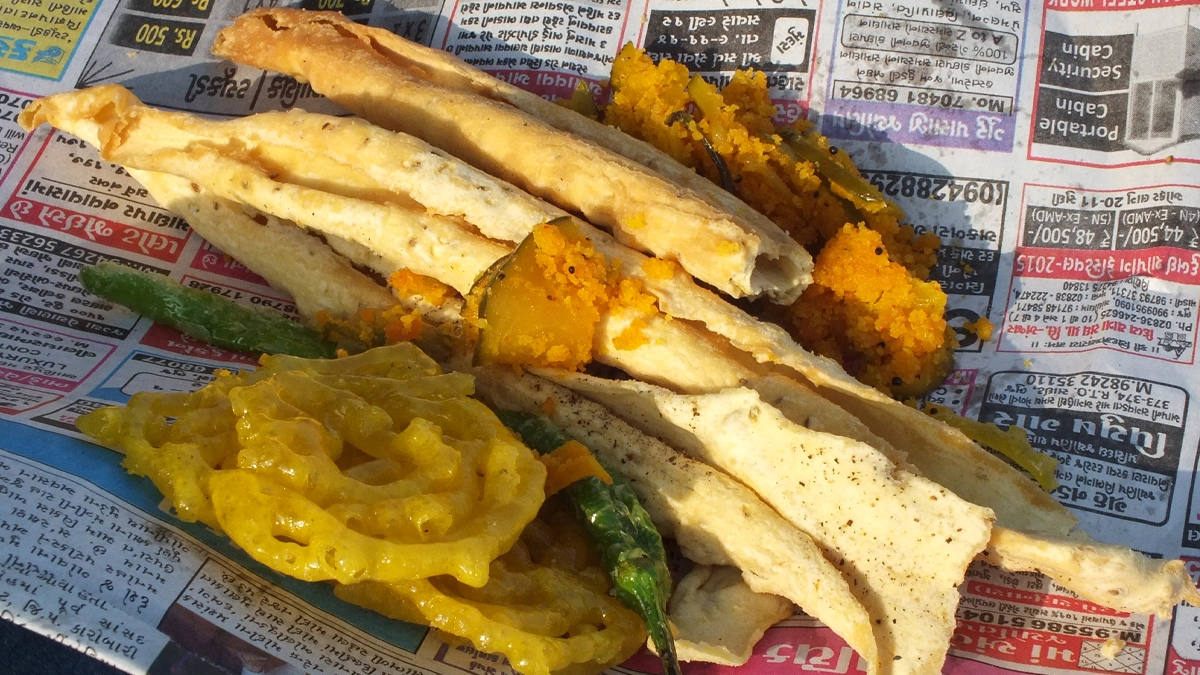 This iconic combination is a popular street food in Gujarat. Fafda is a crispy, deep-fried snack made from gram flour and spices, often enjoyed with a tangy green chutney or a sweet and sour chutney. On the other hand, Jalebi is a deep-fried sweet made from fermented batter soaked in sugar syrup. The contrast of the salty fafda with the sweet jalebi creates a delightful balance of flavours.