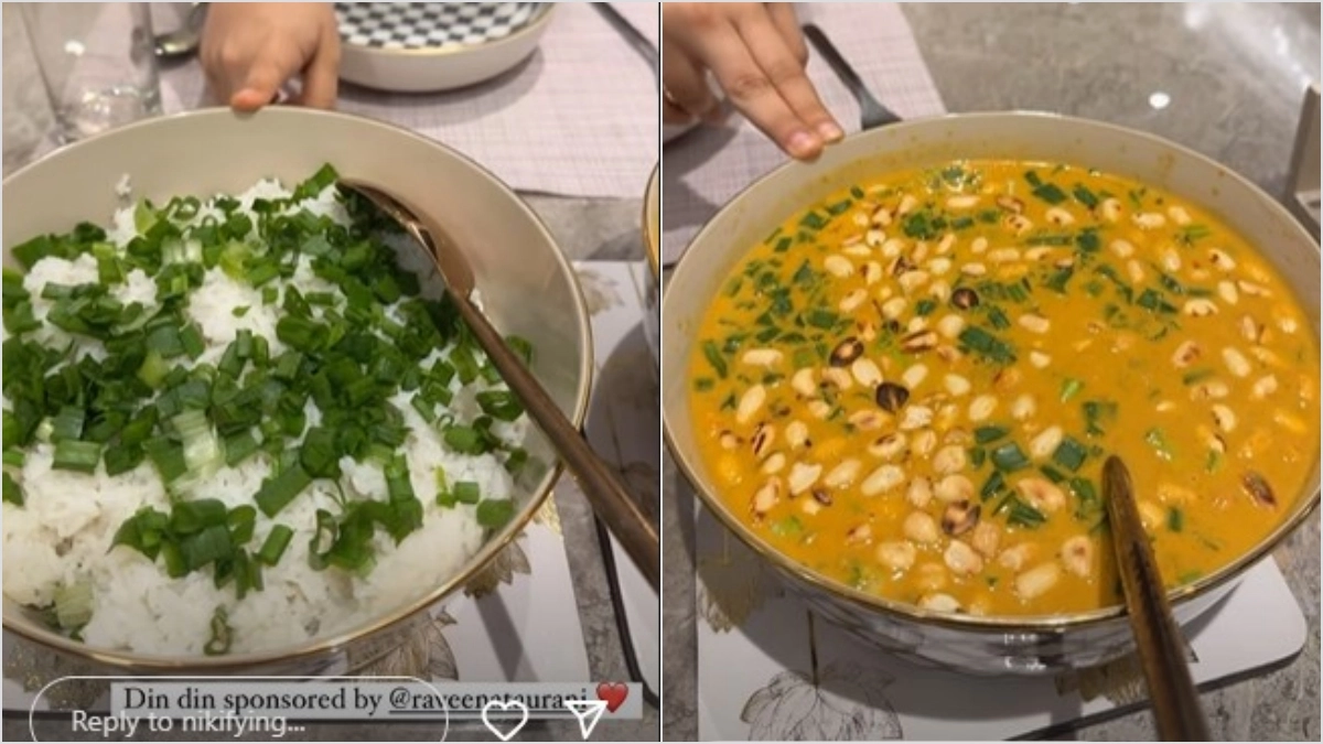 In the video, we can hear Raveena saying, "it is yellow Thai curry, which has mushroom, broccoli, bell peppers, peanuts, and spring onions. And it is steamed rice with lots of spring onions".