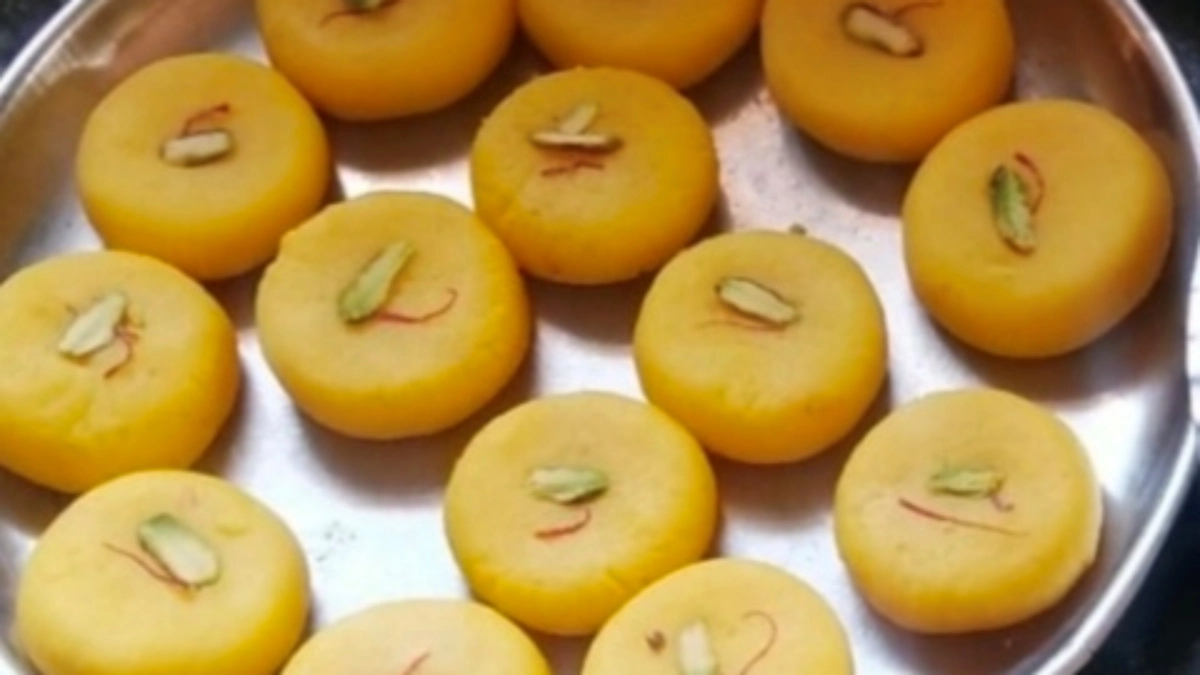 Peda is a rich and flavourful sweet made from condensed milk, ghee, and nuts. Heat ghee in a pan and add milk powder, stirring continuously. Pour in condensed milk and milk, mixing until the mixture thickens. Add nuts and continue cooking until it forms a dough-like consistency. Allow to cool slightly, then shape into small balls or discs.