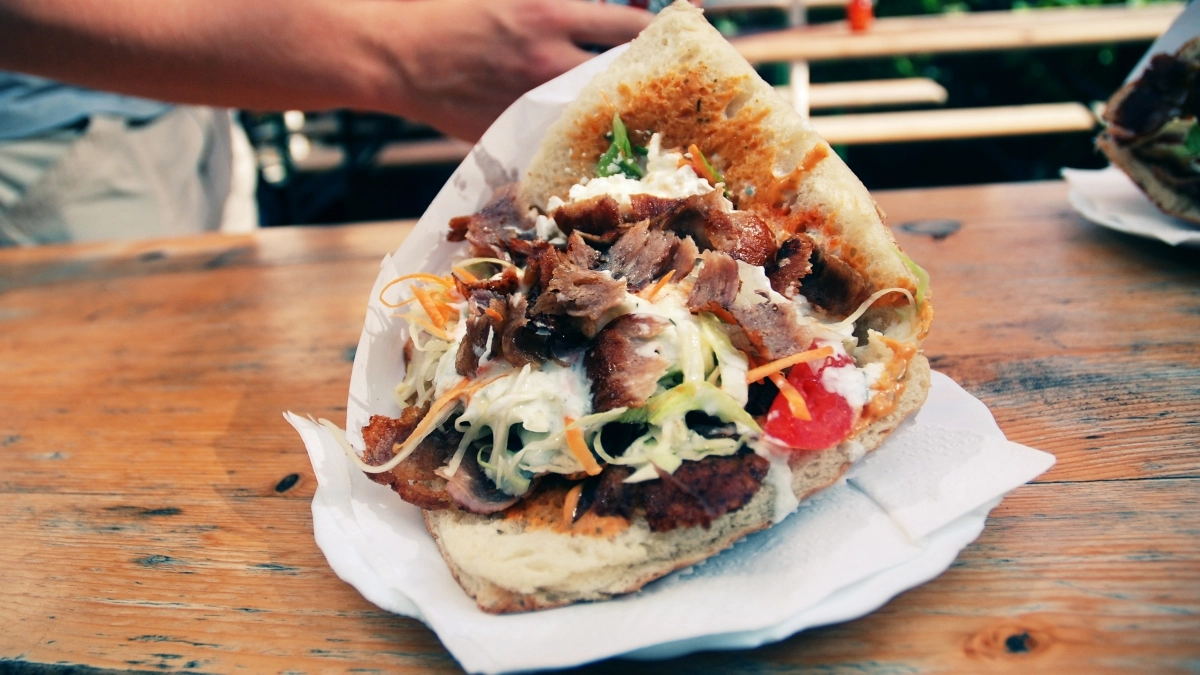 Originating from Ottoman cuisine, doner kebab features thinly sliced meat, typically lamb or beef, stacked on a vertical rotisserie and roasted until tender. It's commonly served in sandwiches or wraps with vegetables and sauce.