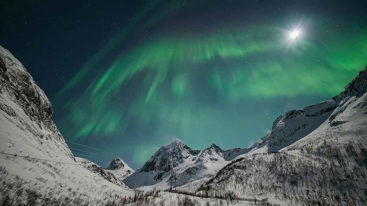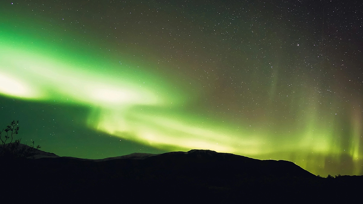 Abisko, Sweden, is another great spot for viewing the Northern Lights due to its special microclimate. The unique 43-mile-long Torneträsk Lake creates the famous ‘Blue Hole of Abisko,’ ensuring clear skies even when surrounding areas are cloudy. With the stunning Kiruna mountains as a backdrop, you'll witness the Northern Lights in various mesmerising forms like coronas, curtains, arcs, or spirals.