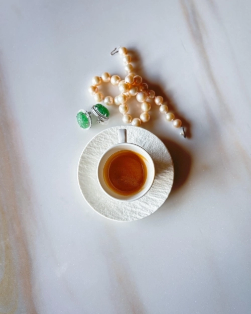 Then there is a snap of her cuppa of espresso, and pearl accessories.