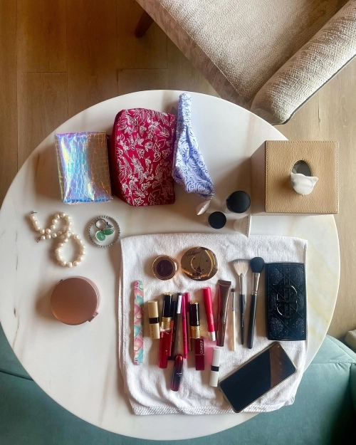 We can see Zeenat's beauty tools-- her makeup brushes, lipsticks, bronzer, highlighter, blush, and face creams.
