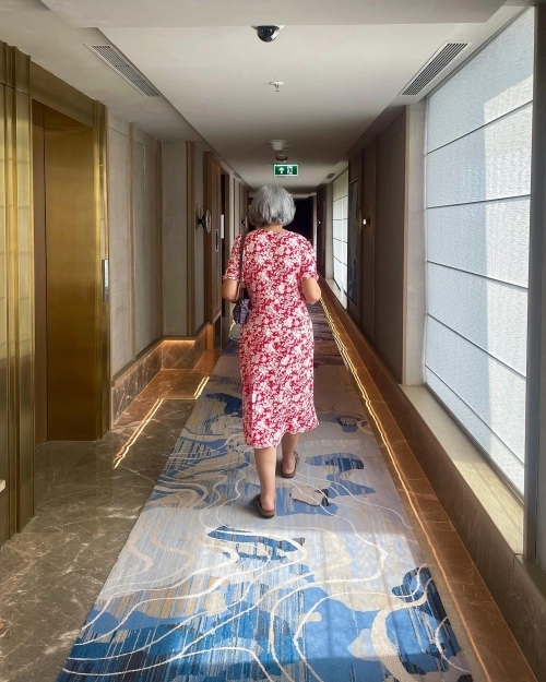 The last picture in the collection shows Zeenat walking in the hallway wearing a red floral outfit, with her back towards the camera.