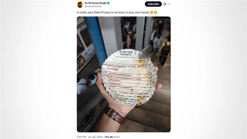 New Delhi, January 29: A viral social media post has ignited a fresh debate over data protection in India after a man discovered sensitive financial documents being reused as disposable plates by a roadside food vendor. The incident gained widespread attention after the X (formerly Twitter) account "Moronhumor" shared a photograph of a snack served on a paper plate. Upon closer inspection, the plate appeared to be fashioned from a bank document containing customer information. However, it has come to notice that the viral photo is old and from 2020.