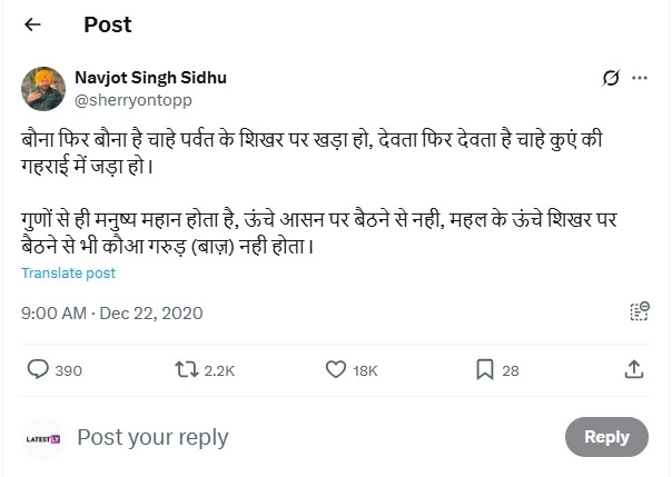 Former Indian cricketer and popular commentator Navjot Singh Sidhu, famous for his quirky Shayari and sharp commentary, tweeted this Hindi phrase on X in 2020. The tweet reads, “Bauna fir bauna hai chahe parvat ke shikhar par khada ho, devta fir devta hai chahe kuen ki gehraai mein jada ho. Gunon se hi manushya mahaan hota hai, oonche aasan par baithne se nahi, mahal ke oonche shikhar par baithne se bhi kauwa garud nahi hota.” It roughly translates in English to "A dwarf remains a dwarf even if he stands on the peak of a mountain, and a deity remains a deity even if placed deep inside a well. A person becomes great because of their virtues, not by sitting on a high throne. Even if a crow sits atop a palace’s highest spire, it does not become a Garuda (eagle)." Well, this tweet is going viral when you search for the viral audio.