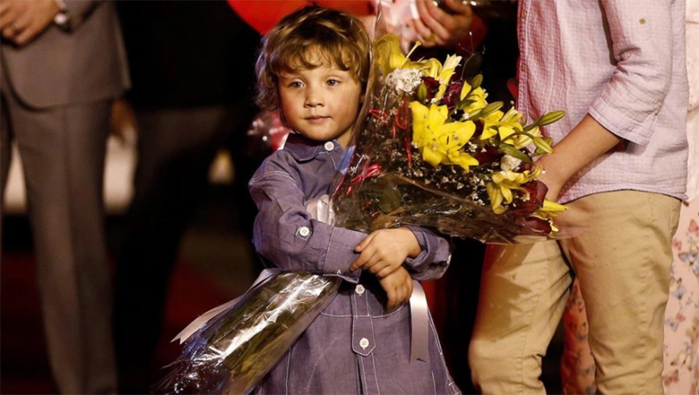 Hadrien holding a bouquet of flowers after their arrival in New Delhi