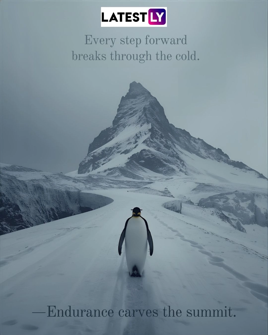 The Scale (Overwhelming): The mountain in the distance needs to be massive, making the penguin look tiny and insignificant by comparison.
