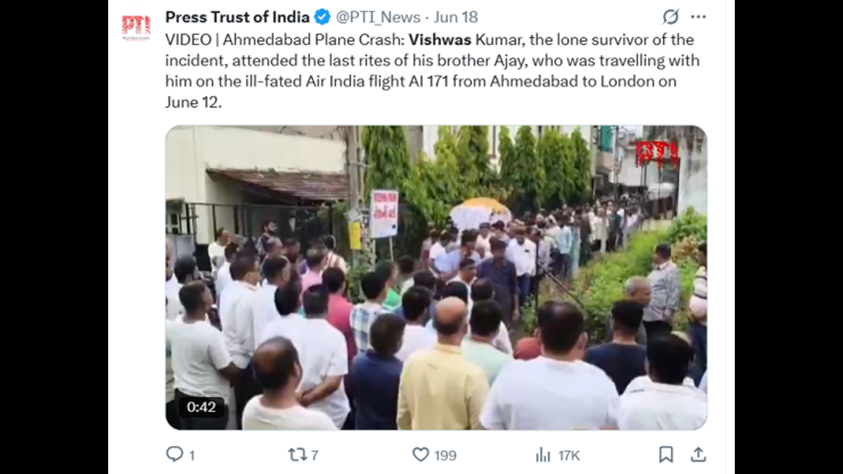 Press Trust of India (PTI) in its X post mentioned Vishwas Ramesh Kumar, the lone survivor of the tragic Air India AI-171 crash in Ahmedabad, performed the last rites of his brother, Ajay Ramesh, who was also onboard the ill-fated flight.