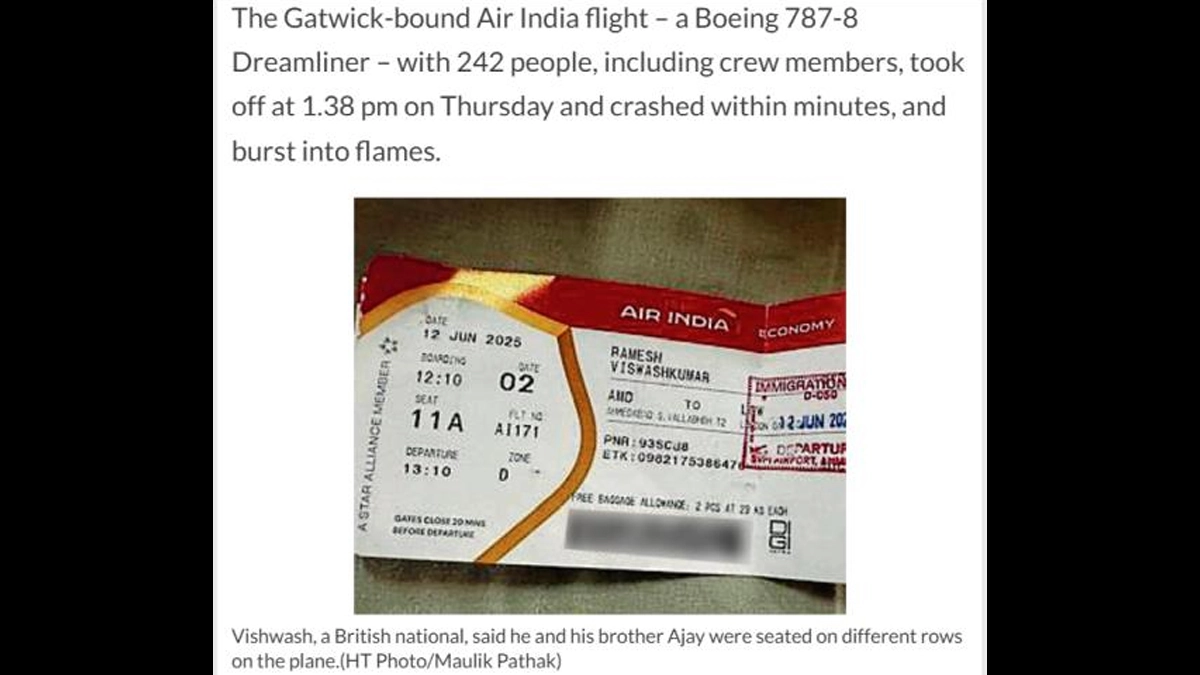 However, we came across a report by Hindustan Times dated June 12, which carried a picture of the boarding pass that highlighted the passenger's name, Vishwash Kumar Ramesh, and his seat number 11A. This finding clarifies that Vishwash Kumar Ramesh did book a ticket. Moreover, the name of the flight mentioned on the pass was ‘AI 171’. The report stated that Vishwash, a British national, was in India for a few days to visit his family and was going back to the UK along with his brother, Ajay Kumar Ramesh (45).