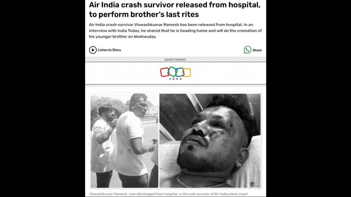 On conducting another set of customised keyword searches, and came across a report by India Today dated June 18, 2025, which mentioned that Air India crash survivor Viswashkumar Ramesh has been released from the hospital. He shared that he is heading home and will do the cremation of his younger brother on Wednesday.