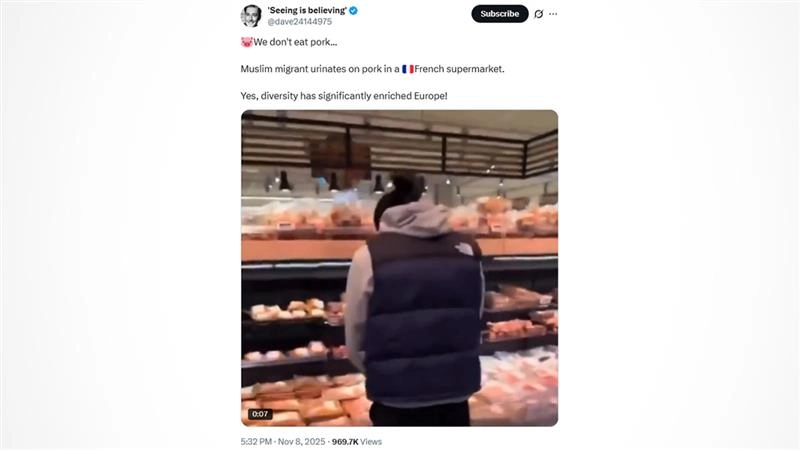 Paris, November 10: A video clip has gone viral on social media, allegedly showing a "Muslim immigrant" urinating on pork products in a French grocery store. The viral video has sparked social media outrage. The video appeared on the X account of 'Seeing in believing' (@dave24144975). The video has amassed over 40 thousand likes and over 18 thousand reposts.