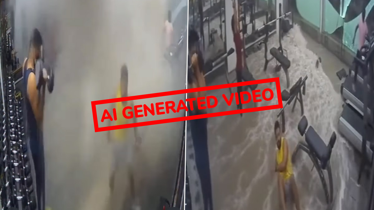 As the video moves further, a wave is seen crashing through the beachside gym and leaving all the people in shock and surprise. The viral clip also shows one man lying on the floor as others continue their workout, soon after the wave crashed through the gym. "Treadmills floating, dumbbells doing laps, and one guy still flexing underwater. Looks like leg day’s postponed till the tide chills," the caption added. Although the video appears to be true, scroll below to see if it is genuine or fake. Did a Tiger Attack a Man at Jim Corbett National Park in Uttarakhand? Viral Reel Is AI-Generated, Reveals Fact Check.