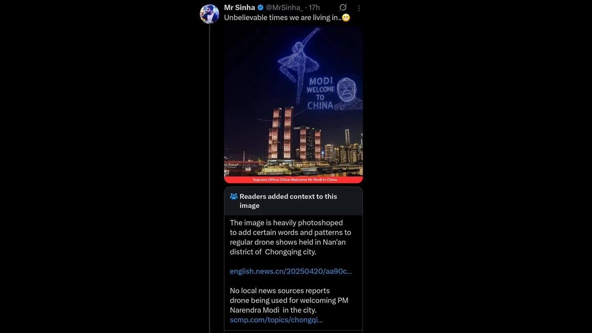 Furthermore, no local Chinese media outlets reported any drone display for the Prime Minister. PM Modi, who is currently on the second leg of his two-nation tour, arrived at Binhai International Airport in Tianjin on Saturday to attend the 25th SCO Heads of State Council summit. He received a traditional welcome with cultural performances, but there was no drone tribute as claimed. Thus, the viral image is a fake claim, created to mislead audiences online.