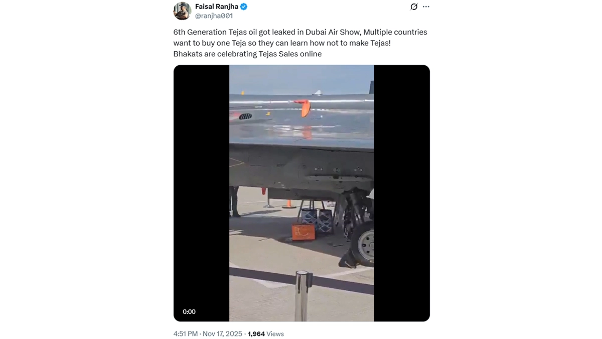 India’s Tejas Fighter Jet Suffered Oil Leakage at Dubai Airshow, Claims X Post