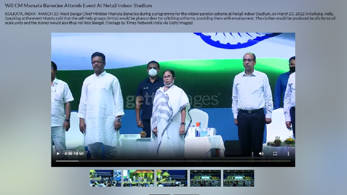 A fact check of the viral clip revealed that the video was edited and shared with a misleading claim. A closer look at the video shows a background screen with Bengali text reading, "Hon’ble Chief Minister Mamata Banerjee will begin distributing widow pensions to new applicants from Netaji Indoor Stadium. Date: March 23, 2022. Time: 1 PM." Notably, the video also features a Getty Images watermark, which is also visible on the clip.