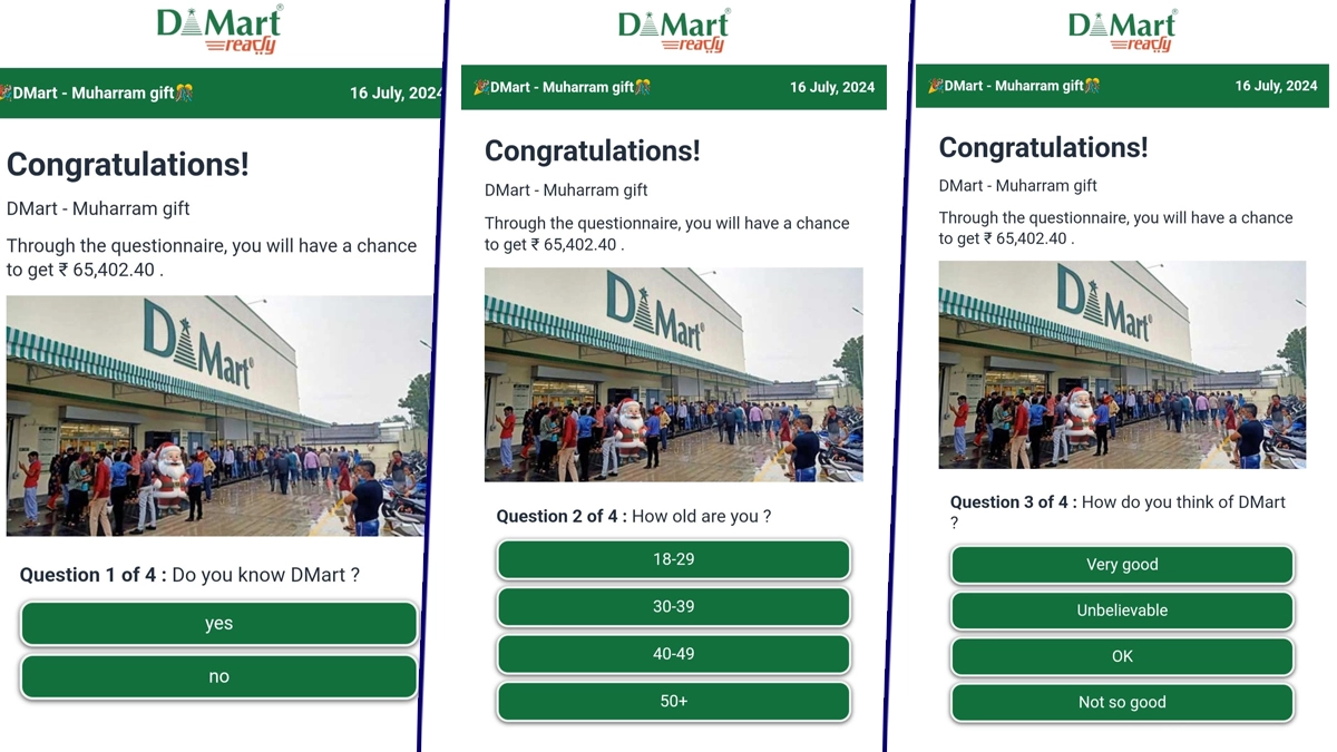 The circulated link and the associated Muharram gift offer are fraudulent. DMart has not announced any online questionnaire competition or gift offer ahead of Muharram. Customers are advised to avoid clicking on suspicious links and to verify any promotions through DMart’s official channels.