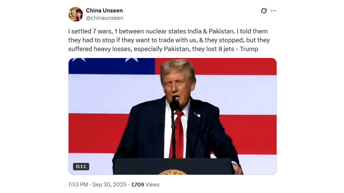 Mumbai, September 30: Did US President Donald Trump claim that India and Pakistan suffered heavy losses, with Pakistan losing eight jets, during a recent public address? A video circulating on X (formerly Twitter) shows Trump allegedly stating, "I settled 7 wars, 1 between nuclear states India & Pakistan. I told them they had to stop if they wanted to trade with us, & they stopped, but they suffered heavy losses, especially Pakistan, they lost 8 jets." The clip has garnered over 7,000 views and sparked widespread discussion online.