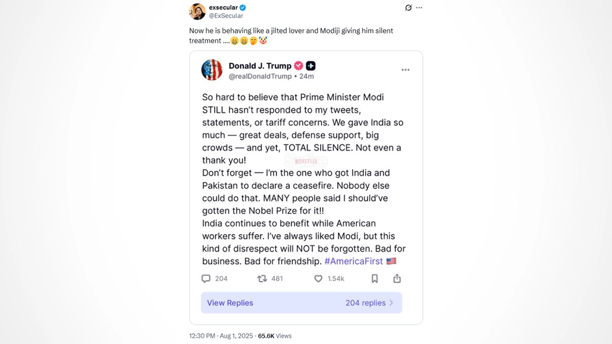 Additionally, the screenshot carries a "Wokeflix" watermark, which means it is a satirical post. Hence, the post currently being shared is fabricated. Social media users are advised to verify the authenticity of such viral claims before sharing them further. Donald Trump’s 25% Tariff on India Comes Into Effect Today.