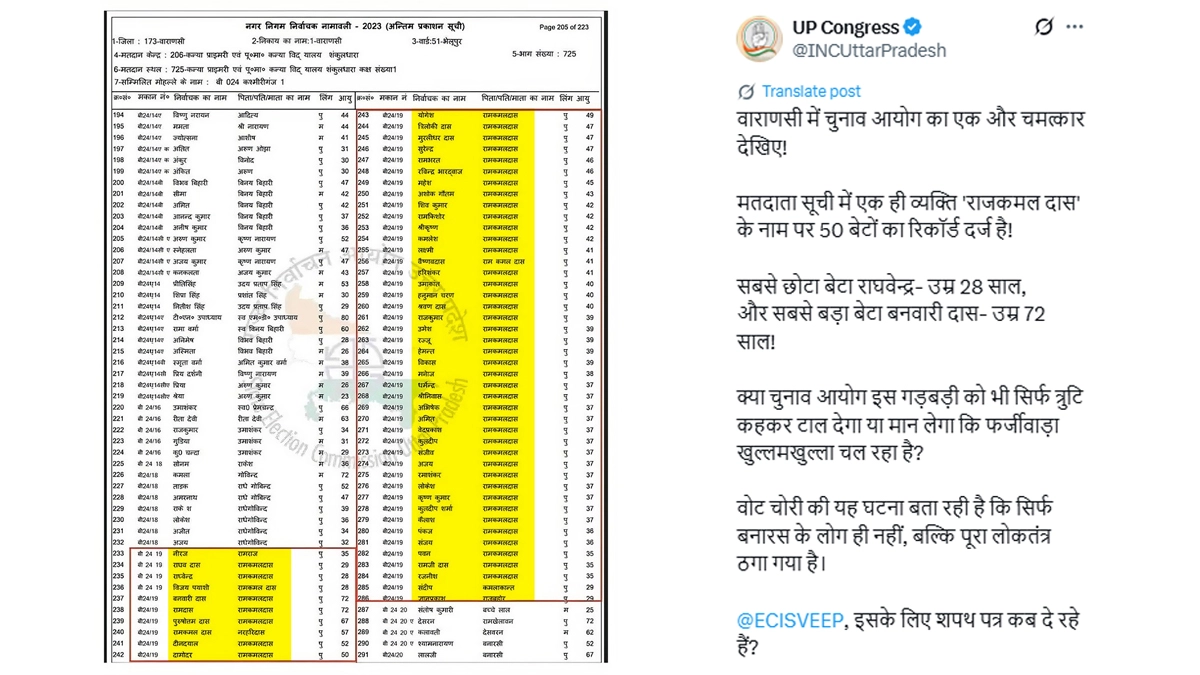 The Uttar Pradesh Congress alleged voter fraud in Varanasi, claiming that over 50 people were listed as the “sons” of a single man named Ramkamal Das in the electoral roll.