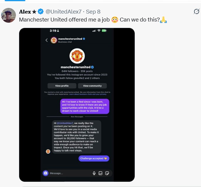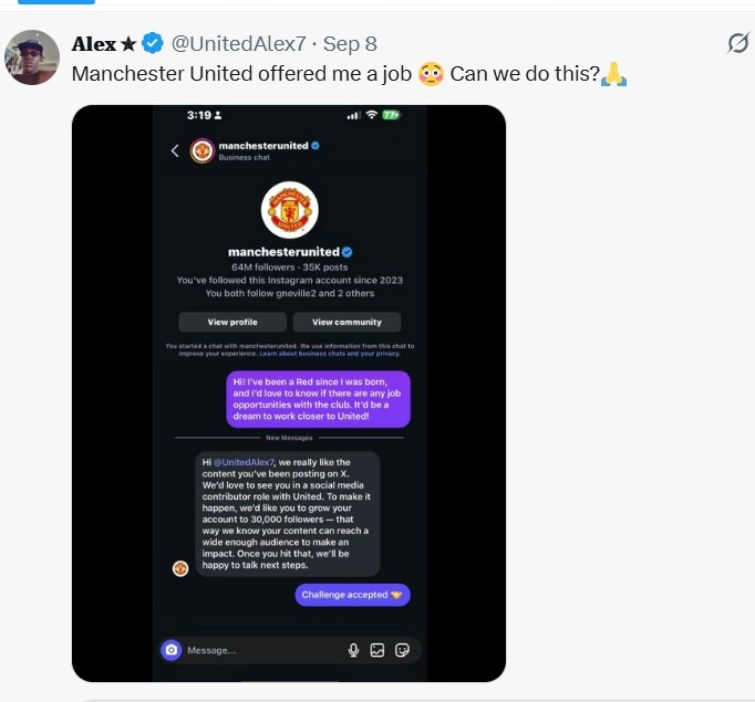Manchester United asked 'X' user to raise follower number to 30,000 as part of a job offer.