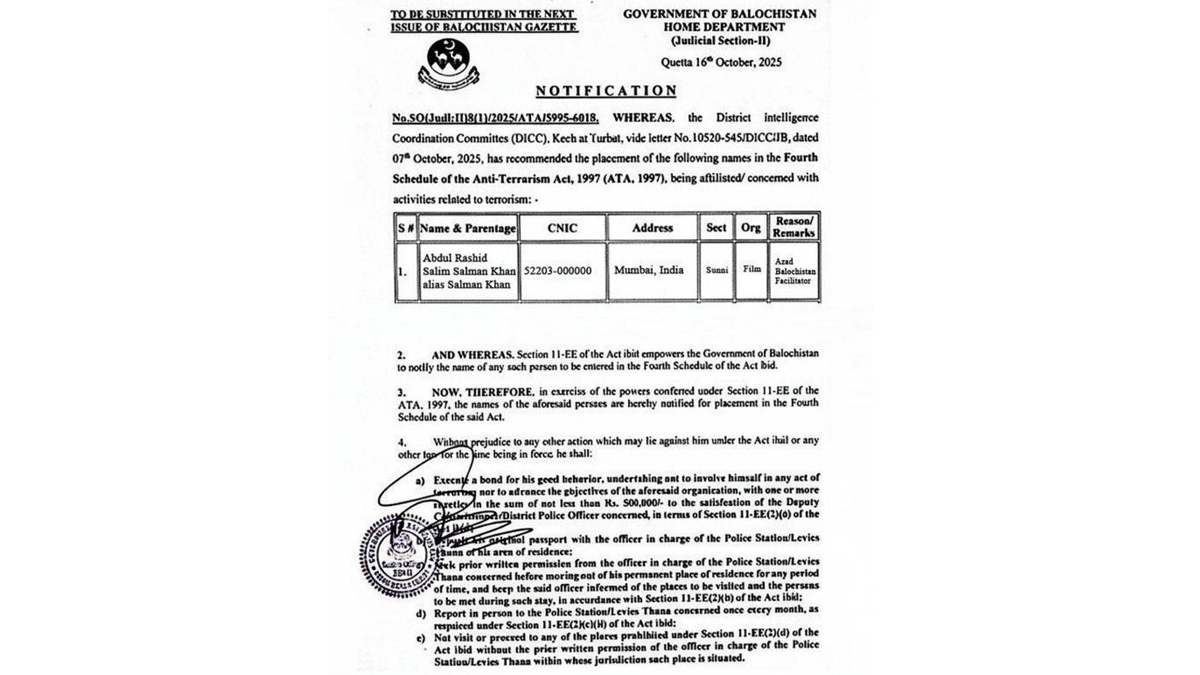 While Balochistan separatist leaders have welcomed Salman Khan's statement, reports suggest that the Pakistani government are displeased by the remark. According to a notification going viral on the internet, the Bollywood superstar has been labelled a terrorist and placed under the 4th Schedule of Pakistan's 1997 Anti-Terrorism Act. As per the notification, the recommendation for Khan to be tagged as a "terrorist" was given on October 7.