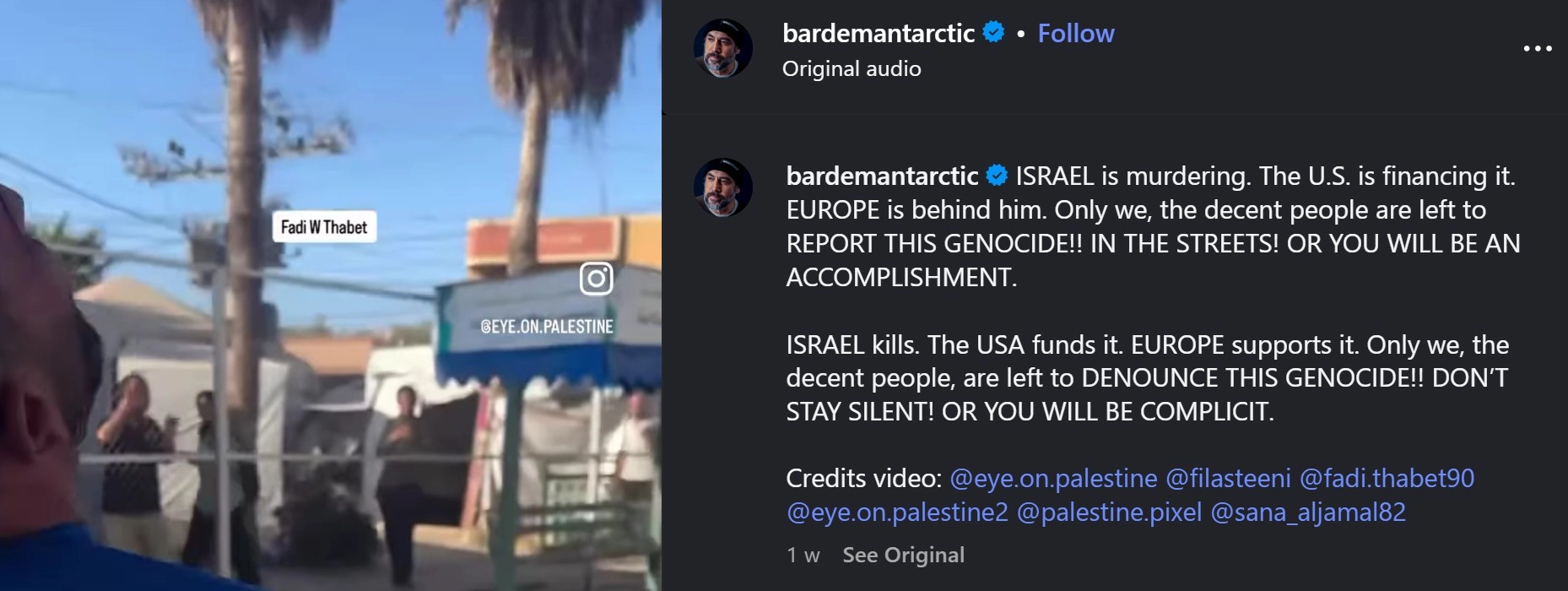 The quote in question actually comes from Javier Bardem, the Oscar-winning Spanish actor, recently seen in Brad Pitt’s upcoming racing drama F1. Bardem posted a harrowing video on Instagram showing a Palestinian man holding his deceased child. In the caption, Bardem wrote, “ISRAEL kills. The USA funds it. EUROPE supports it. Only we, the decent people, are left to DENOUNCE THIS GENOCIDE!! DON’T STAY SILENT! OR YOU WILL BE COMPLICIT."