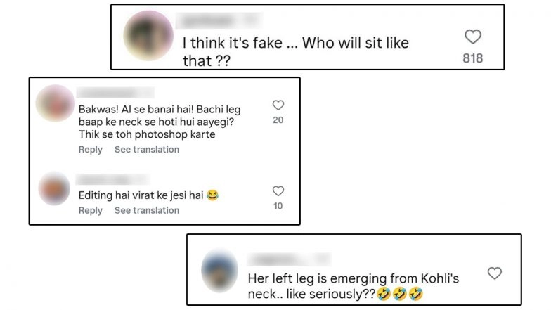 We closely examined the photo and found several inconsistencies. Let's list those observations. First, Vamika, who turned 4 in January 2025, appears much older in the picture. Second, Vamika's right leg seems to be passing through Virat Kohli's neck, popping out right between his chest area, something that’s very easy to spot. Third, the alleged family photo shows Vamika resembling her mother a lot, which actually isn't the case. Previously leaked pictures of the baby showed her resembling Virat more than her mother. These anomalies raise suspicion that the photo might be fake and AI-generated. Virat Kohli, Anushka Sharma Attend Wimbledon 2025 in London, Celebrity Couple Spotted in the Gallery During All-England Tennis Championship Match (See Pic).