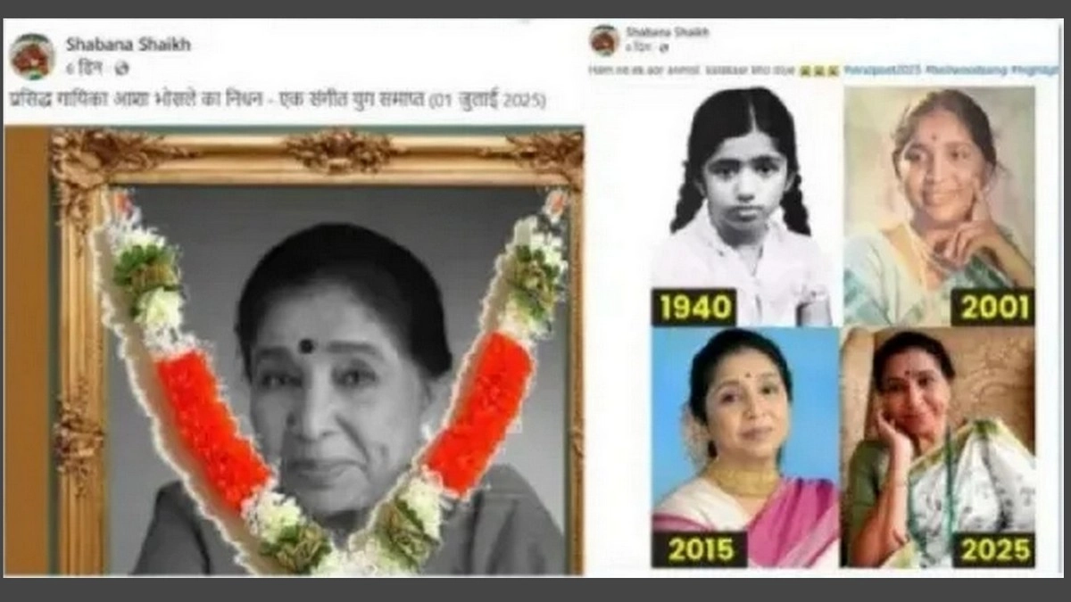 Rumours of yet another Bollywood celebrity death have gone viral since July 11, 2025, with a social media post claiming that legendary Indian playback singer Asha Bhosle has died. Our Fact Check reveals that the news is far from the truth. These rumours seem to be part of a death hoax that began on social media on July 1, 2025. The Facebook page of a user named ‘Shabana Shaikh’ first posted about the “death” of veteran singer Asha Bhosle, with her garlanded photo. The post went viral, and fans of the legend were in panic mode. Shabana Shaikh wrote in the caption alongside the image of Asha Bhosle, "Famous singer Asha Bhosle passed away - a musical era ends (01 July 2025)." One more social media post shared the same FAKE NEWS about Asha Bhosle, saying, "Ham ne ek aor anmol kalakaar kho diye (We have lost yet another phenomenal artiste)." It’s important to find out whether the news about Asha Bhosle’s death is true or false.