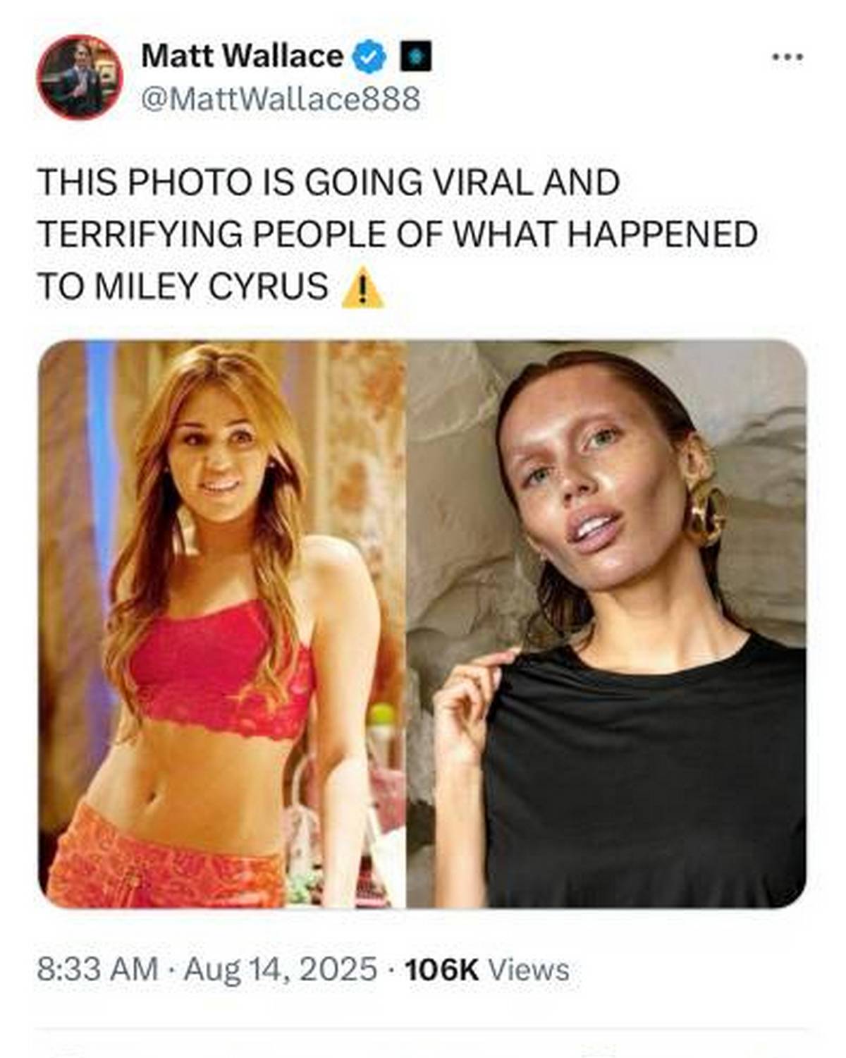 Moreover, this is not the first time Matt Wallace has posted an AI-generated of Miley Cyrus. He had shared similar before-after photos of the “Wrecking Ball” singer earlier this year. A Fact Check done by Lead Stories in May 2025 had revealed the image to be Fake. Take a look.
