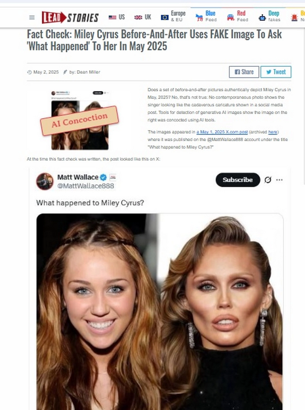 Fact Check by Lead Stories With Matt Wallace Tweet on Miley Cyrus’ AI-Generated Photo