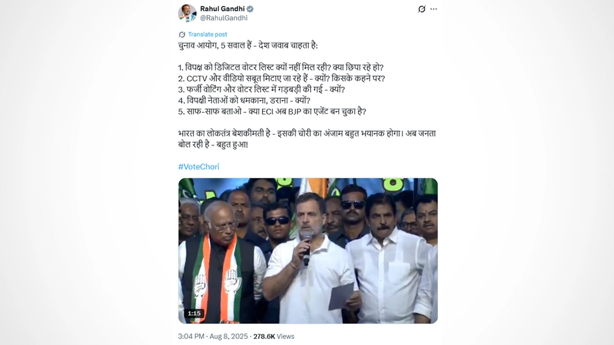Delhi, August 8: Is the Election Commission of India (ECI) colluding with the BJP to manipulate voter lists and rig elections? This question was forcefully raised by Congress leader Rahul Gandhi, who on August 7 took to X to demand answers from the ECI, posting, "Election Commission, there are 5 questions - the country demands answers: 1. Why isn't the opposition getting the digital voter list? What are you hiding? 2. CCTV and video evidence are being erased - why? On whose orders? 3. Fake voting and tampering with the voter list - why? 4. Threatening and intimidating opposition leaders - why? 5. Tell us clearly - has the ECI now become an agent of the BJP?"
