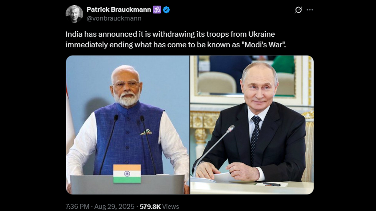 Mumbai, August 30: A claim is going viral on social media, suggesting that India is withdrawing its troops from Ukraine amid the war with Russia. The post, made by author Patrick Brauckmann on platform X, reads: "India has announced it is withdrawing its troops from Ukraine immediately, ending what has come to be known as 'Modi's War'."