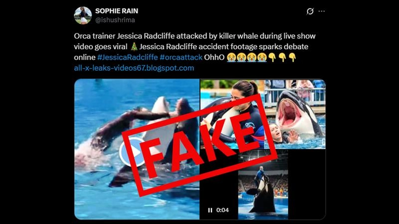 The claim is found to be a fake as there is no credible evidence to support it. No marine park statements, obituaries, occupational safety reports, or news coverage exist for a person named Jessica Radcliffe. Investigations by Vocal Media, The Star (Kenya), and Hindustan Times found the video footage and images to be AI-generated. The so-called attack visuals use fabricated scenes, manipulated audience sounds, and misleading captions to create a false narrative. The “Jessica Radcliffe” identity itself appears to be entirely fictional.