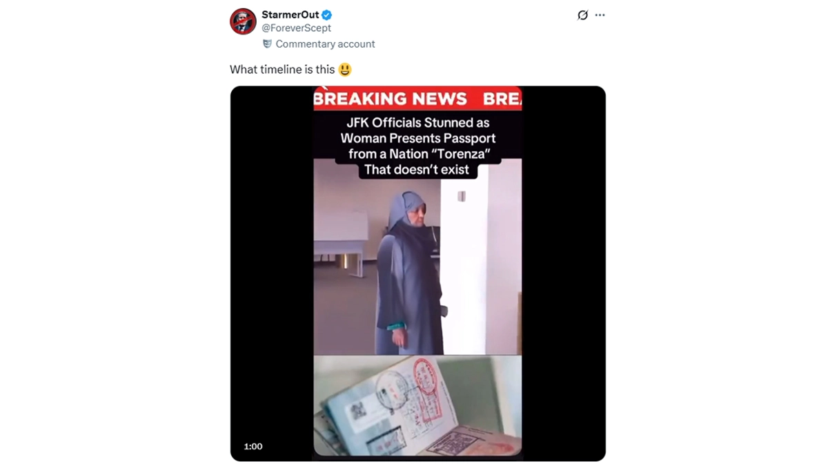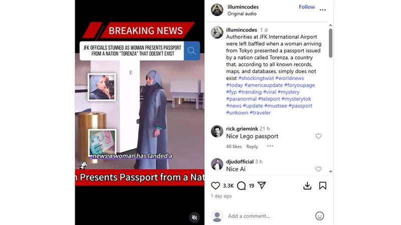 A viral video claims a woman arrived at JFK Airport carrying a passport from a nonexistent country called Torenza.