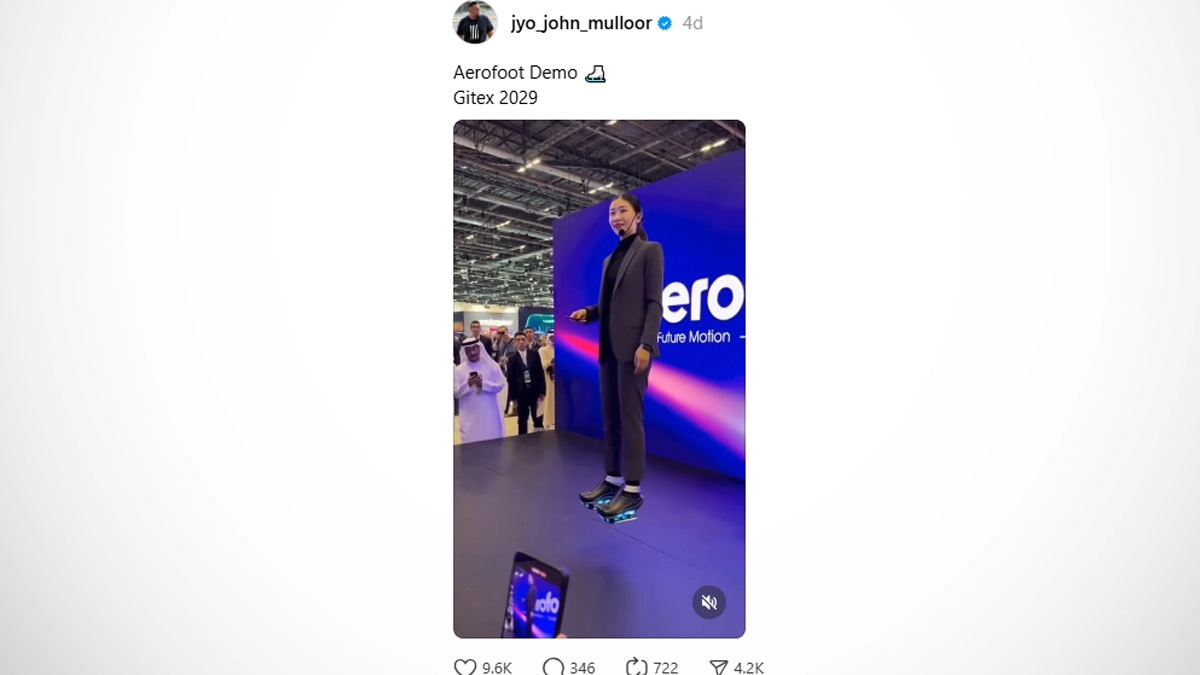 Viral videos claim to show Aerofoot “flying shoes” debuting at Gitex 2029 in Dubai, with people hovering and walking mid-air.