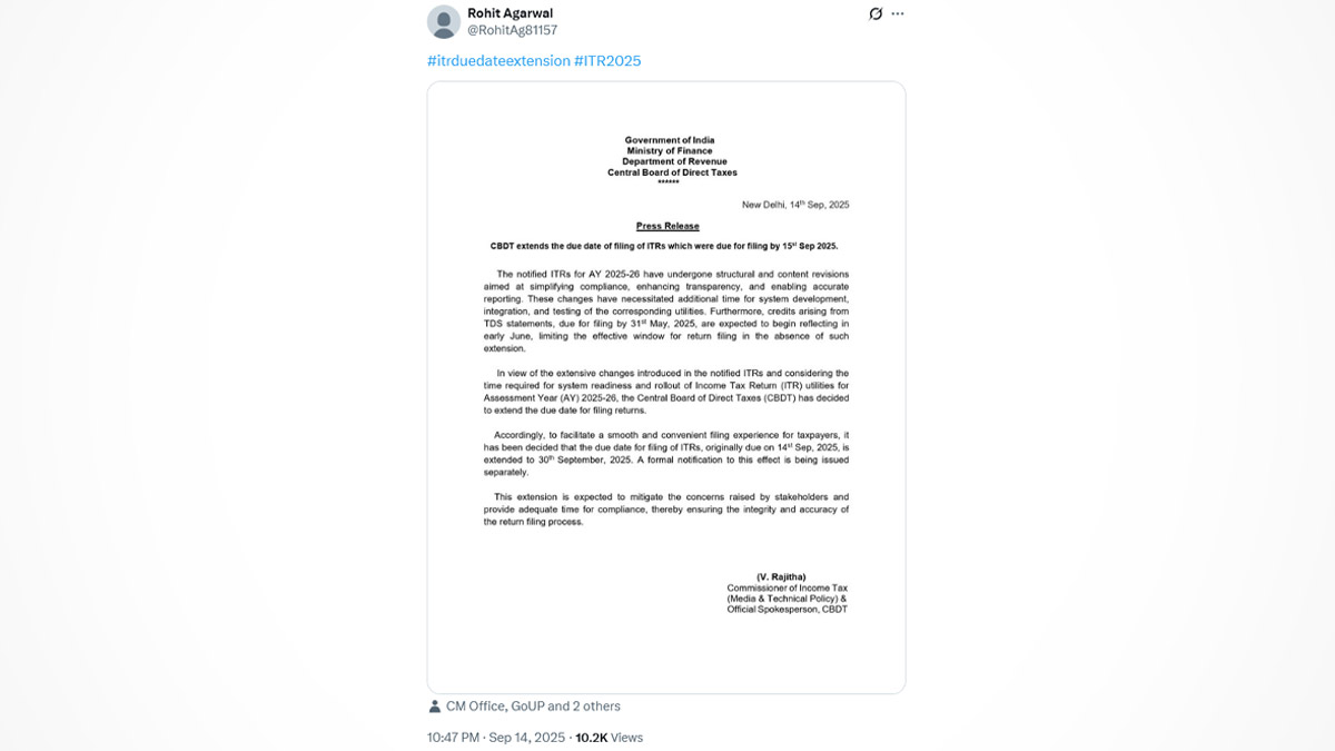 The letter, purportedly issued by CBDT, was shared on X by a user ‘Rohit Agarwal’. "In view of the extensive changes introduced in the notified ITRs and considering the time required for system readiness and rollout of Income Tax Return (ITR) utilities for Assessment Year (AY) 2025-26, the Central Board of Direct Taxes (CBDT) has decided to extend the due date for filing returns," the purported letter read. "Accordingly, to facilitate a smooth and convenient filing experience for taxpayers, it has been decided that the due date for filing of ITRs, originally due on 14 Sep, 2025, is extended to 30th September, 2025. A formal notification to this effect is being issued separately," It further said. ITR Filing Deadline Extension: CBDT Changes Last Date To File Income Tax Returns to September 16.