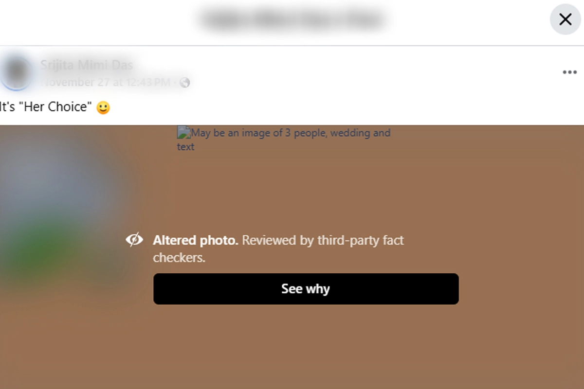 According to DNA, the image’s origin is traced to a Reddit community named Desi Adult Fusion. The page is known for sharing AI-generated artwork inspired by traditional desi culture. It was first posted on this subreddit on November 18, 2024, along with other AI-generated images, before one of them made it to Facebook and other social media platforms, leading to misinformation. In addition, before the viral post opens, it shows a warning stating ‘altered photo’ in the lead to view the image.