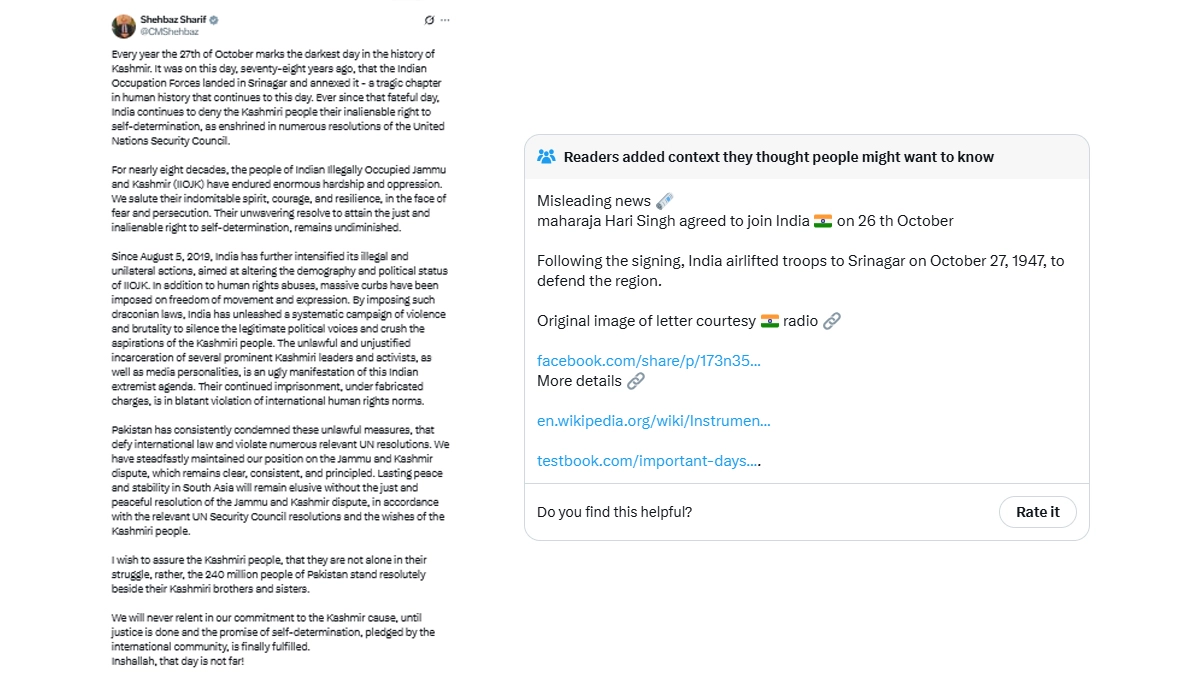Community Notes Gives Pakistan PM Shehbaz Sharif History Lesson, Says Kashmir Legally Joined India on October 26