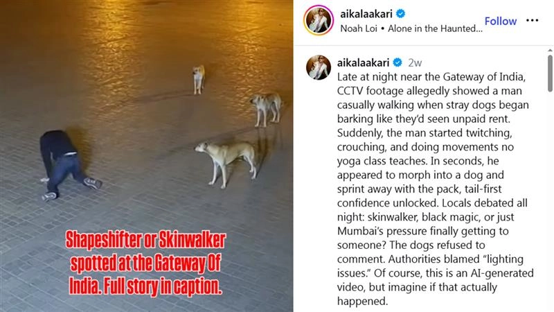 Since the video has surfaced on social media, many are sharing the video, believing it to be true. Late at night near the Gateway of India, CCTV footage allegedly showed a man casually walking when stray dogs began barking like they’d seen unpaid rent. Suddenly, the man started twitching, crouching, and doing movements no yoga class teaches. In seconds, he appeared to morph into a dog and sprint away with the pack, tail-first confidence unlocked. Locals debated all night: skinwalker, black magic, or just Mumbai’s pressure finally getting to someone? The dogs refused to comment. Authorities blamed “lighting issues,” the caption on the video read. Did a Fire-Breathing ‘Dragon’ Enter a House in Chambal? Viral Video is AI-Generated, Reveals Fact Check.