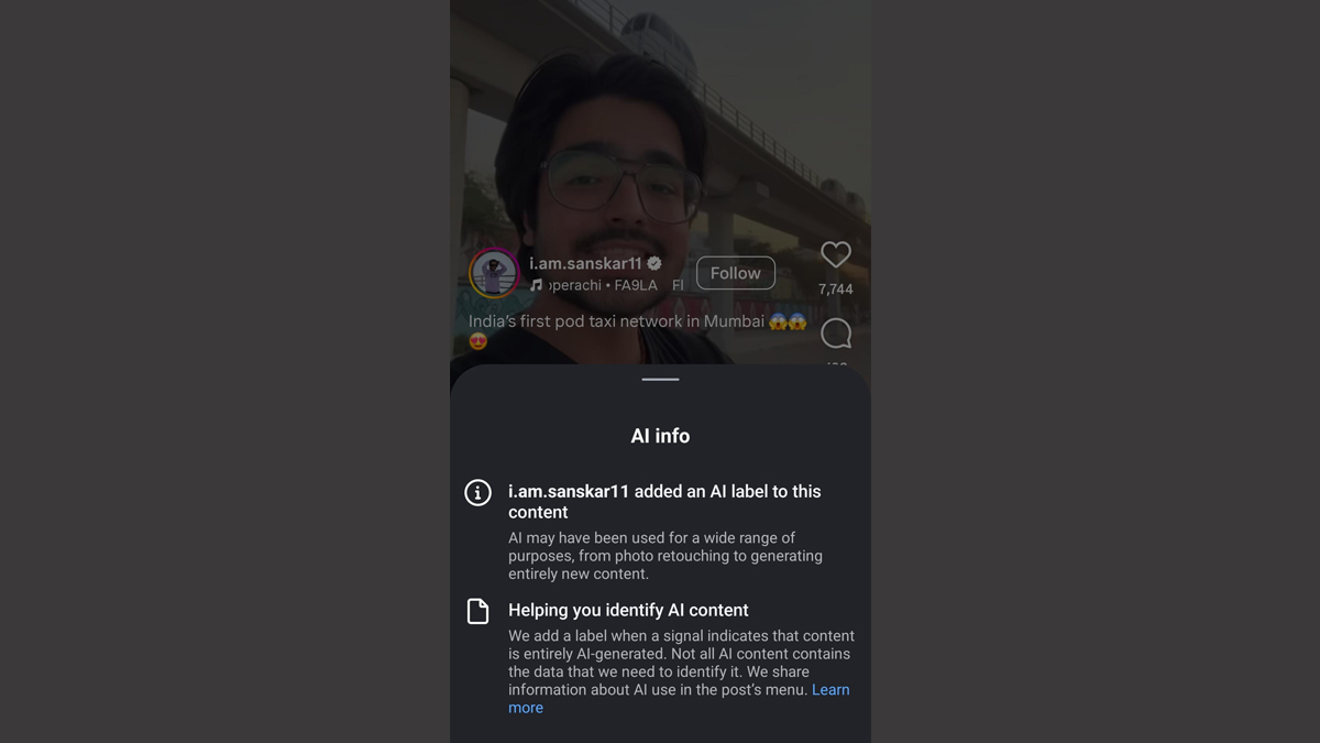A fact check of the viral clip revealed that the viral video was created using artificial intelligence (AI) technology. A ticker on the "India's first pod taxi service in Mumbai" video stated that the Instagram influencer added an AI label to the content, thereby confirming that the viral clip was made using AI technology. We also found discrepancies in the caption of the post and the statement made by the content creator. In the video, Sanskar Nagwani is seen claiming that he has come to take a ride in the newly launched pod taxi network.