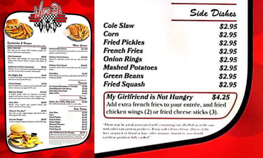 It's a relationship problem that almost every couple would have faced at one point or another. So Mama D' diner came up with a solution by adding extra fries, chicken wings or cheese sticks to any meal. Opened just two months ago in Arkansas, the restaurant is now going viral for its unique and thoughtful menu card. The "dish" costs $4.25 and is described on the menu as: "Add extra French fries to your entrée, and fried chicken wings (2) or fried cheese sticks (3)." Ham or Watermelon? Internet Is Having a Meltdown Over This Restaurant Serving Smoked Watermelon That Looks Exactly Like Pork!