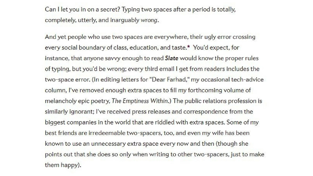 Why bother to put so much time and effort into this non-issue right? But studies on the same topic have been conducted in the past too, which threw up all kinds of conclusions. A 2005 study showed that a two-space gap after the full stop helped reduce lateral interference of the eyes and helped simplify reading. Ten years later, another study refuted the findings of the 2005 study. And in 1998, an experiment had concluded that neither conventions made any difference to reading!