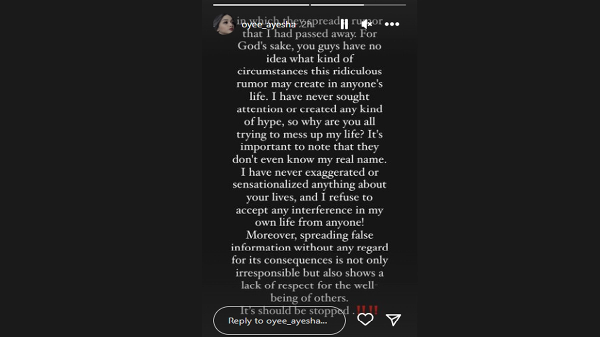 āMoreover, spreading false information without any regard for its consequences is not only irresponsible but also shows a lack of respect for the well-being of others. Itās should be stopped [sic],ā Tiktoker Ayesha added in her stories debunking her death hoax news.