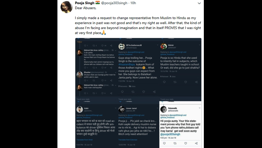Airtel user Pooja Singh who courted controversy on social media for requesting a Hindu representative to solve her issue with reinstallation has taken to Twitter showcasing the abuses she is being showered with after the incident. Singh was massively trolled on social media for requesting services from a Hindu customer care executive on Sunday.