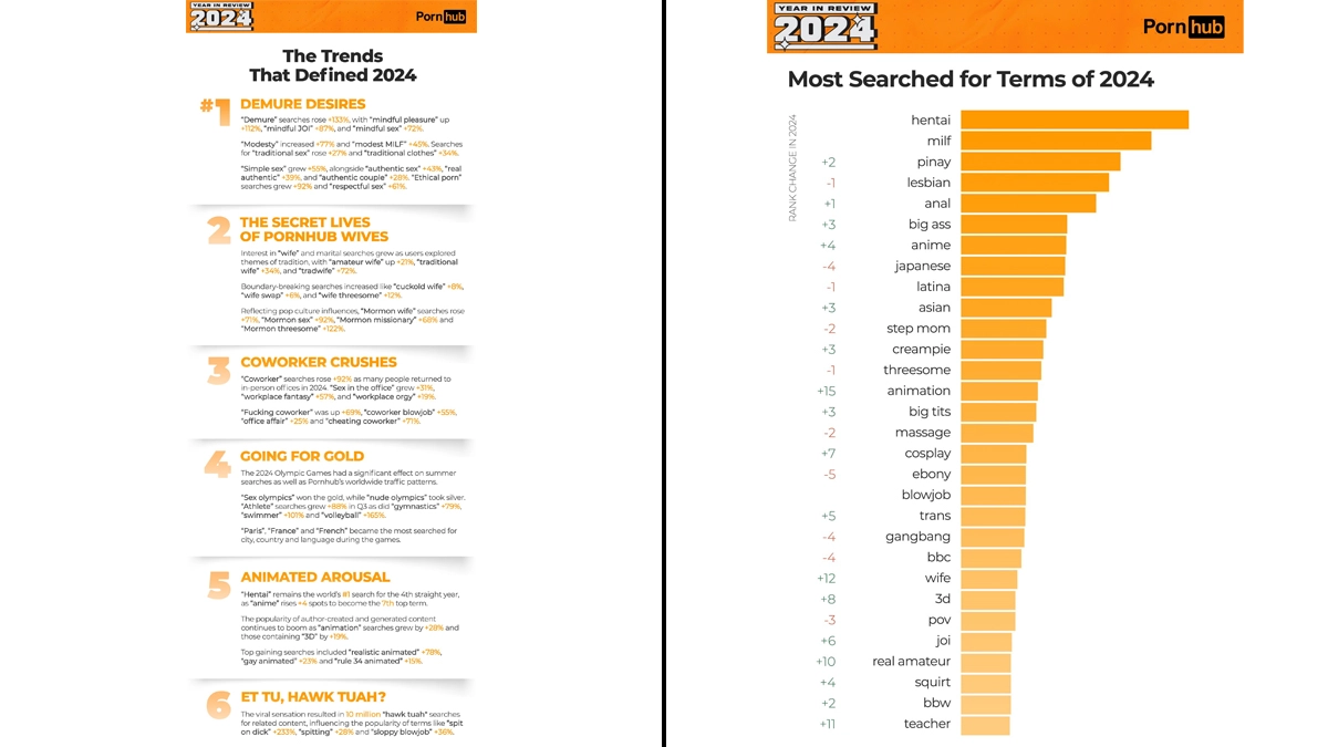 The top trend of 2024 was demure desires, which were heavily inspired by the popular TikTok videos. Searches like mindful pleasure, simple sex, traditional clothes, ethical porn, respectful sex, and more were searched. Other trends were the secret lives of the Pornhub wives, coworker crushes, and going for gold, which was influenced by the 2024 Paris Olympics. The next most searched trends were animated arousal and Et Tu, Hawk Tuah.