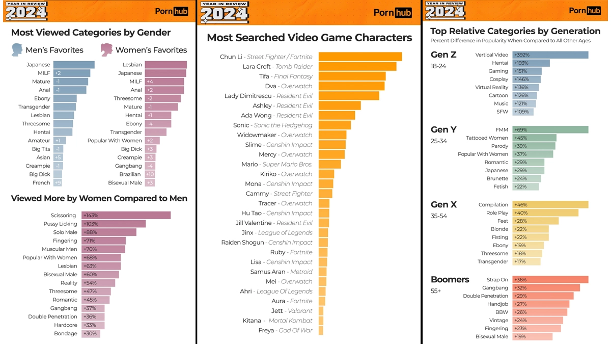 The most searched video game characters were Chun Li from Street Fighter, Lara Croft from Tomb Raider, and Tifa from Final Fantasy. A few of GenZ's top searches were vertical video, Hentai, and gaming. The top searches by GenY were FMM, tattooed women, and parody, and the top searches by GenX were compilation, role play, and feet. Top searches by Boomers included strap on, gangbang, and double penetration. View the complete list below. Erection Day! Pornhub Reveals Which US State Was the Horniest on Election Day 2024 Amid X-Rated Searches Surge Among the Americans.